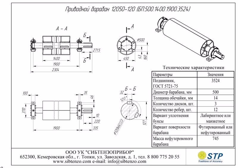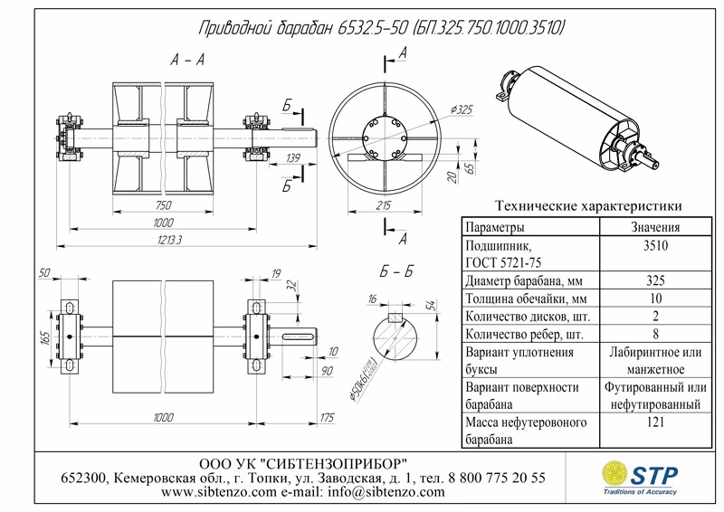 Шир. ленты В, мм Типоразмер приводного барабана Допуст. нагрузка Sб, даН Условное обозначение подшипника Размеры, мм Масса, кг Чертеж